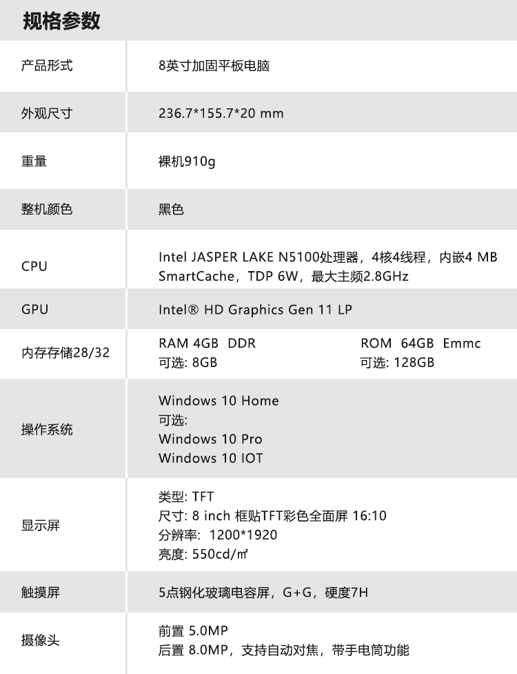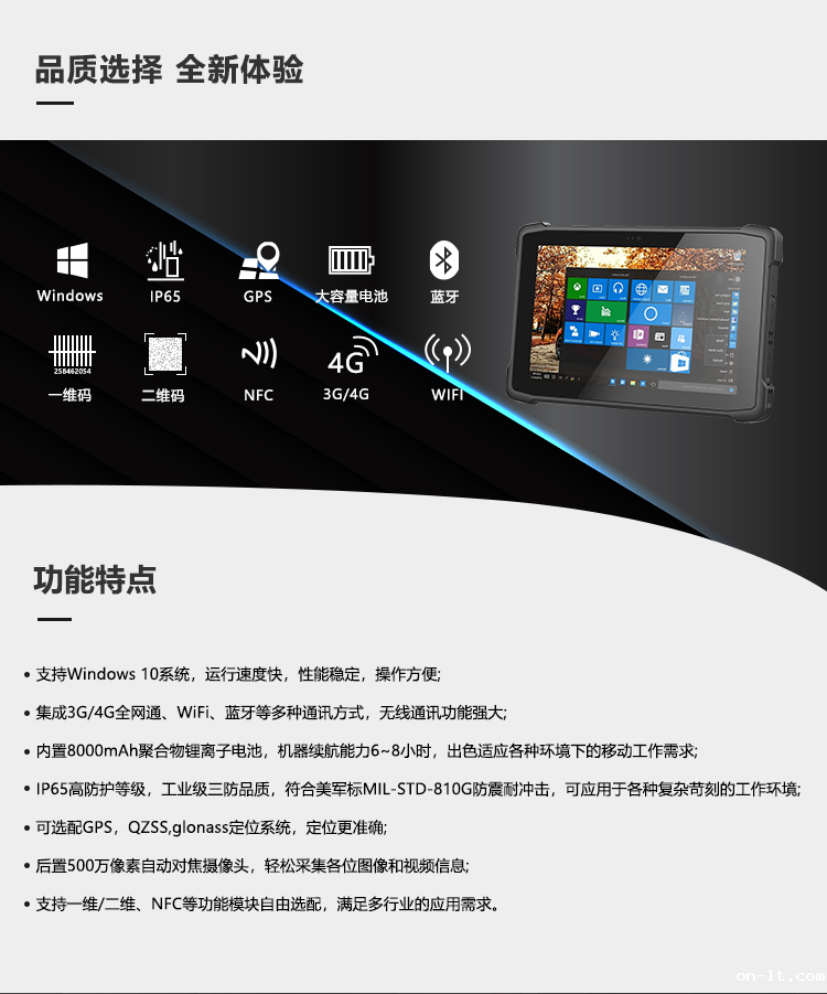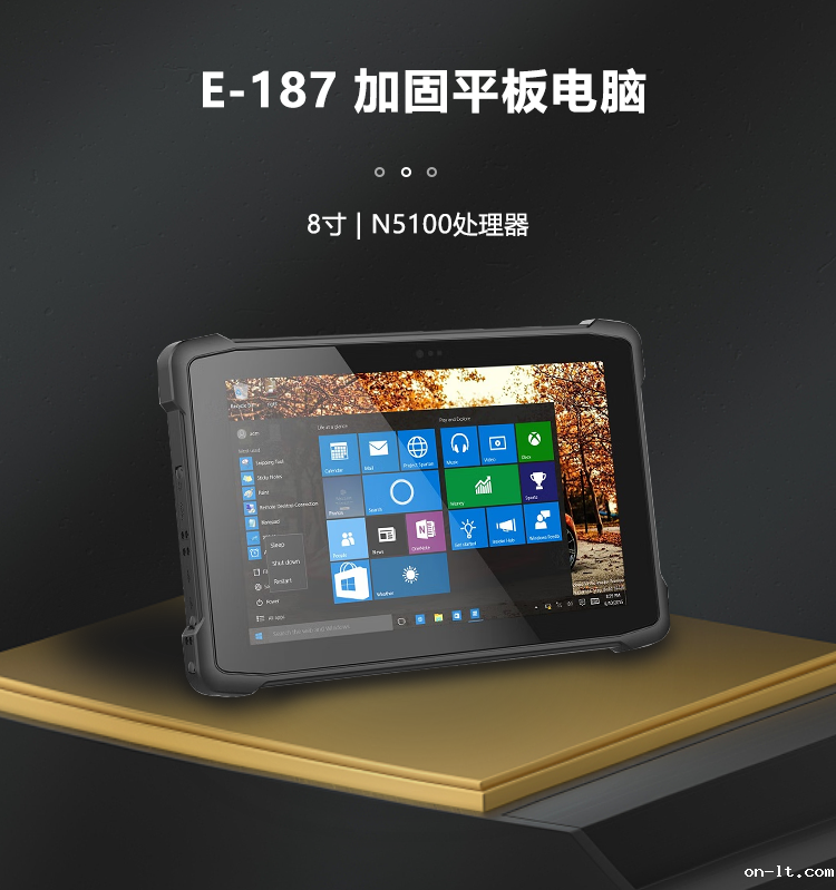 E-187-加固平板电脑支持Windows 10系统,运行速度快,性能稳定,操作方便;内置8000mAh聚合物锂离子电池,机器续航能力6~8小时,出色适应各种环境下的移动工作需求;IP65高防护等级,工业级三防品质,符合美军标MIL-STD-810G防震耐冲击,可应用于各种复杂苛刻的工作环境。