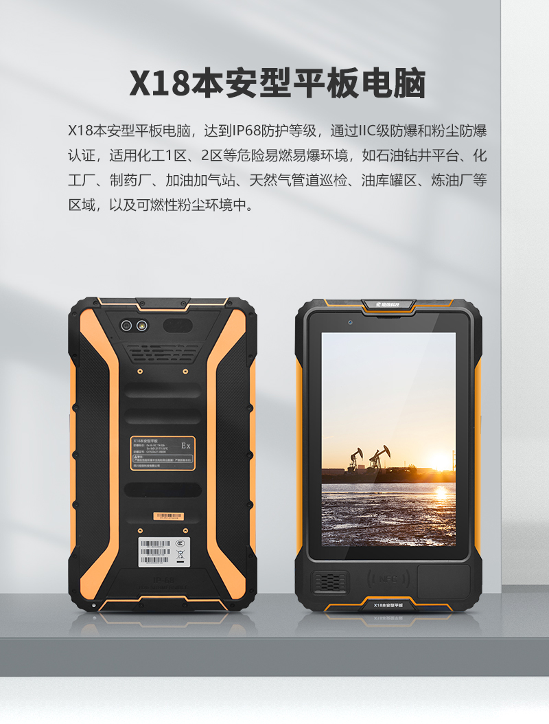 X18本安型平板电脑,达到IP68防护等级,通过IIC级防爆和粉尘防爆认证,适用化工1区、2区等危险易燃易爆环境,如石油钻井平台、化工厂、制药厂、加油加气站、天然气管道巡检、油库罐区、炼油厂等区域,以及可燃性粉尘环境中。