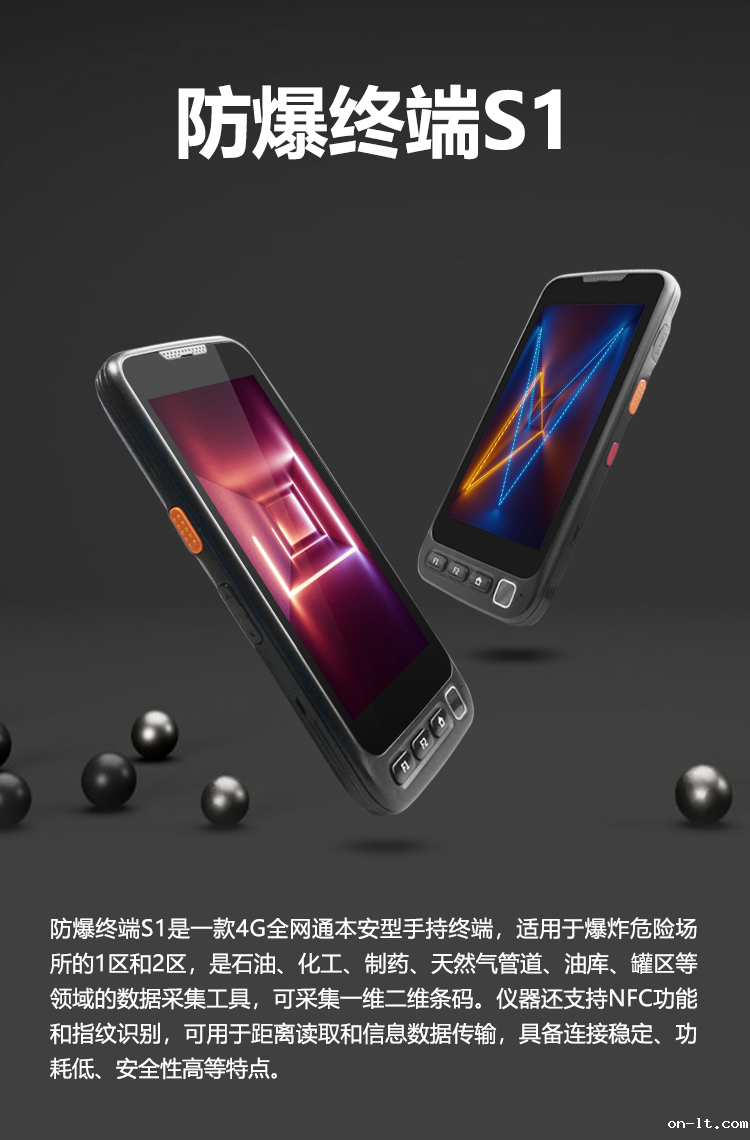 防爆终端S1是一款4G全网通本安型手持终端,适用于爆炸危险场所的1区和2区,是石油、化工、制药、天然气管道、油库、罐区等领域的数据采集工具,可采集一维二维条码。仪器还支持NFC功能和指纹识别,可用于距离读取和信息数据传输,具备连接稳定、功耗低、安全性高等特点。