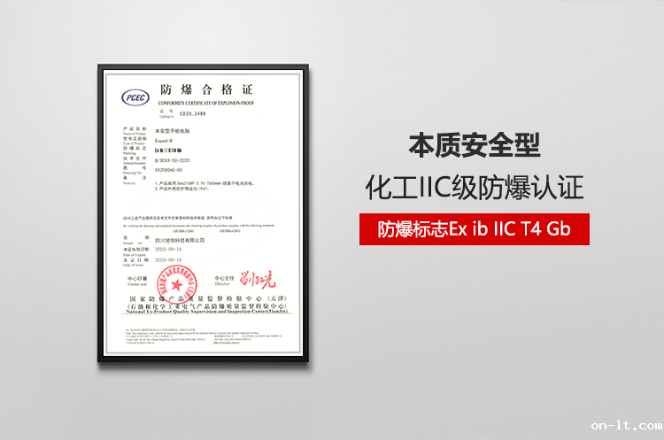 Expad-8本安型平板电脑采用本安型电路设计,通过化工IIC级防爆认证,防爆标志Ex ib IIC T4 Gb,操作系统windows 10。